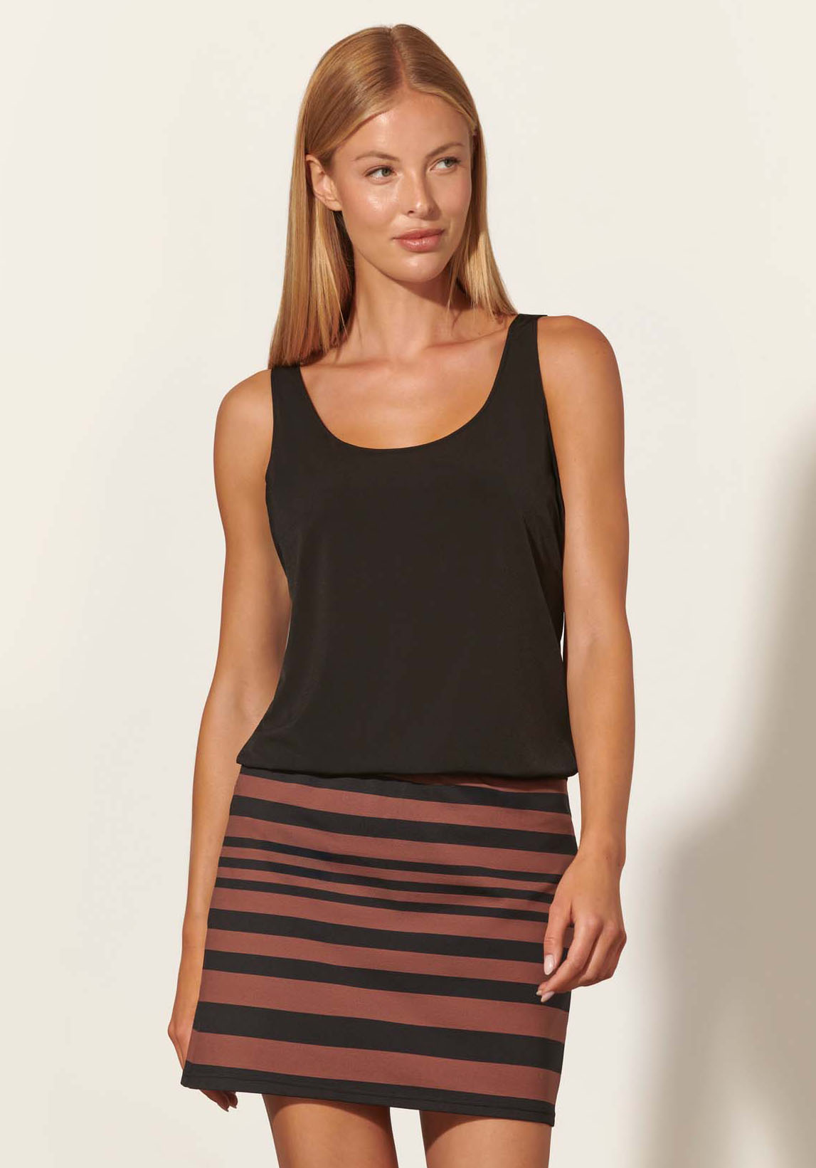 Con su estampado de rayas irregulares en tonos marrón chocolate y negro, el vestido completa el look con un toque moderno, fresco y elegante.